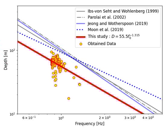 Figure 8 shows the results of this study in comparison with similar studies conducted in other parts of the world. Some of the previous studies have shown a good agreement with each other, but the results of this study indicate much shallower bedrock depths given the same frequency in comparison with others. This suggests that the bedrock depth would be overestimated if the results of previous studies were used in the study area. Among the previous studies, the slope of the Ibs-von Seht and Wohlenberg [] model was the closest to the result of this study; the slopes of other models, except for the Moon et al. [] model, also fell within the standard error of this study.