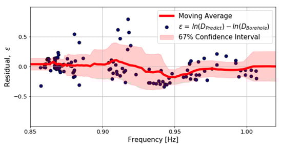 We calculated the residuals between the predicted bedrock depths, obtained from the power-law model defined in Equation (4), and the bedrock depths obtained from the borehole data. In Figure 9, the red line and filled area represent the moving average and 67% confidence interval, respectively, which were calculated by applying windows of 24 data points. By trialing the moving average with different binning schemes, we confirmed that using windows of 24 points effectively represented the variations in the means and standard deviations of the residuals. Figure 9 shows that the power-law model of the bedrock depth derived in this study was consistent with the observation and the standard deviations of the residuals were generally smaller than 0.3. This suggests that a measurement of the f0 using the HVSR method could provide a quick estimate of the bedrock depth in the Nakdonggang delta region and valuable input for regional seismic hazard studies and regional-scale seismic performance assessments of structures [,,,]. However, the inconsistency between the empirical models demonstrated in Figure 8 suggests that the relationship between the f0 and bedrock depth is region-specific.