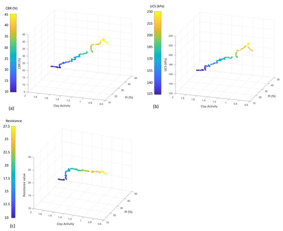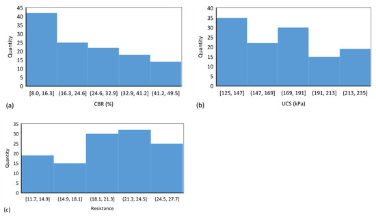 Distribution of the database used based on (a) CBR, (b) UCS, and (c) resistance values.