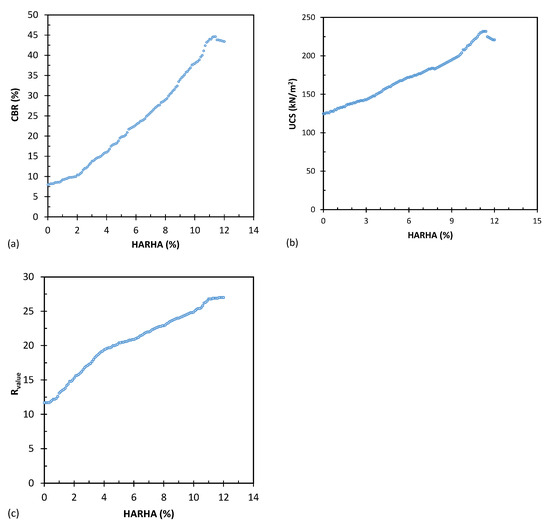 Effect of HARHA on (a) CBR, (b) UCS, and (c) resistance values.