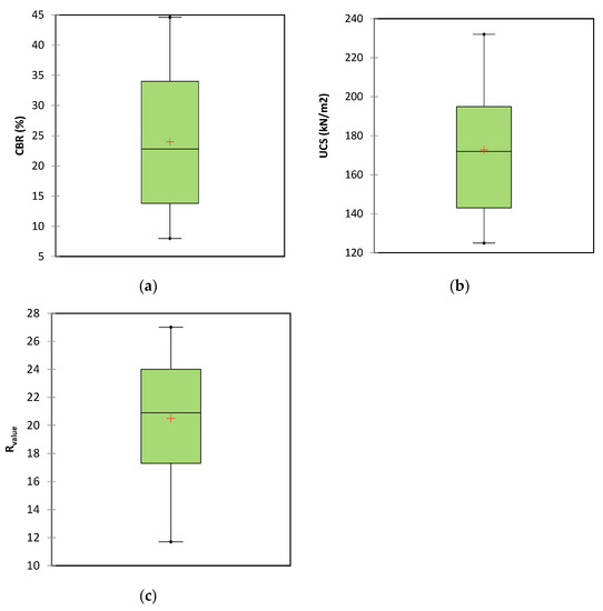 Box plot of output to find outliers for (a) CBR, (b) UCS, and (c) Rvalue.