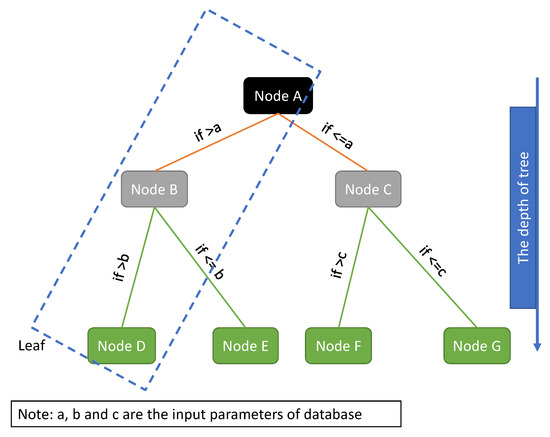 Figure 5 shows a typical decision tree, comprising multiple nodes and branches. As depicted in the figure, a combination of nodes and branches forms a leaf. Each node is bifurcated into left and right nodes, guided by specific rules assigned to each branch (for example, if Node A is less than or equal to ‘a’, then proceed to Node C). Ultimately, the final node within each leaf reveals the predicted output (exemplified by nodes D–G in Figure 5).
