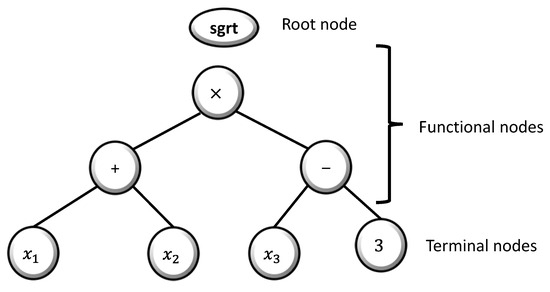Genetic programming manipulates and optimizes a population of computer models (or programs) to find the best-fitting solution for a given problem. It involves creating an initial population of models, each comprising sets of user-defined functions and terminals. These functions may include mathematical operators (e.g., , , , and /), Boolean logic functions (e.g., AND, OR, and NOT), trigonometric functions (e.g., sin and cos), or other custom functions, while the terminals can consist of numerical constants, logical constants, or variables. These elements are randomly combined in a tree-like structure, forming a computer model that is evolved over generations to improve its performance in solving the problem at hand, as represented in typical GP tree structures. Figure 6 shows an example of a function of .