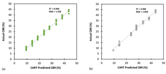 The results of CART modelling for predicting CBR using (a) training and (b) testing databases.