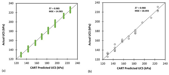 The results of CART modelling for predicting UCS using (a) training and (b) testing databases.