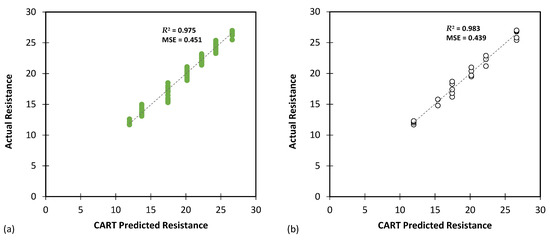 The results of CART modelling for predicting Rvalue using (a) training and (b) testing databases.