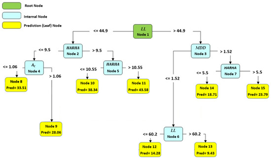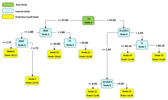 A specific type of DT, known as regression tree (RT), employs recursive partitioning to divide the dataset into smaller regions with manageable interactions [,]. RT consists of root nodes, interior nodes, branches, and terminal nodes. It utilizes a binary-dividing procedure based on questions about independent variables to achieve optimal splits and construct a tree with high purity [,].