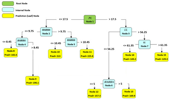 Figure 10, Figure 11 and Figure 12 illustrate the optimal and best CART models for predicting the CBR, UCS, and Rvalue, respectively. Each model consists of 15 nodes, with the LL, PL, and PI serving as the root nodes, respectively. The model determined the number of nodes, which is an outcome of the modeling process. The node count can vary based on the initial tree depth chosen. A higher initial tree depth can result in more nodes, leading to increased model complexity and longer processing times. In this context, an optimal model consisted of 15 nodes.
