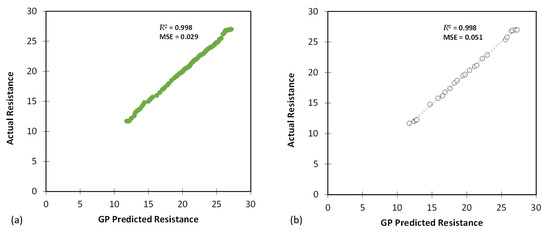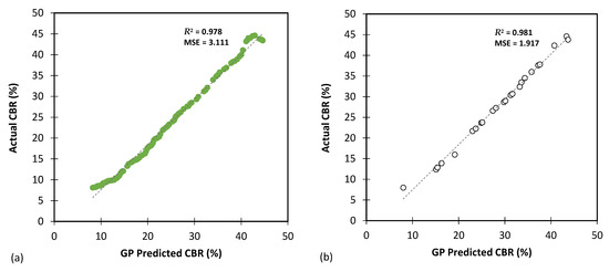 The results of GP modelling for predicting the CBR for (a) training and (b) testing databases.