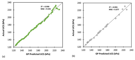 Figure 13, Figure 14 and Figure 15 show comparisons between the predicted CBR, UCS, and Rvalue generated by the GP model and the actual values based on results obtained from the testing and training databases. The GP model exhibited a highly satisfactory performance for predicting the CBR, UCS, and Rvalue parameters.