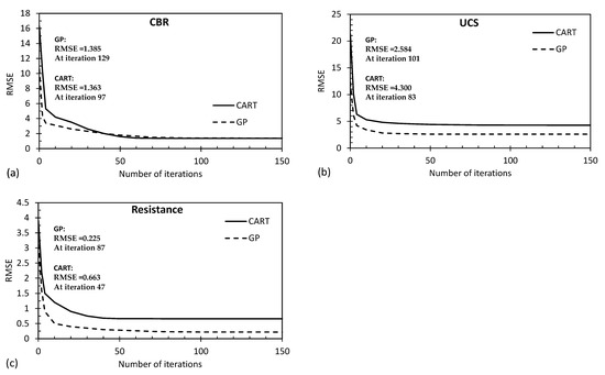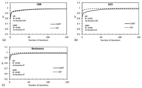 Comparing the two models, CART generally outperformed GP in terms of predicting the UCS and Rvalue, particularly on the testing database. However, for the CBR predictions, CART demonstrated a slightly better performance on the training database, while GP performed slightly better on the testing database. Overall, both models proved effective in predicting the geotechnical properties under investigation. Additionally, the study assessed the importance of individual input parameters in the predictive models. This analysis provided valuable insights into the sensitivity of each model to specific parameters, helping identify critical factors influencing the models’ performance. The findings of this study contribute to the understanding of using data-driven approaches in predicting engineering properties of soils, which can have significant applications in geotechnical engineering and construction. The developed models offer valuable tools for engineers and researchers to make accurate predictions based on specific input conditions, facilitating informed decision making in various geoengineering applications.