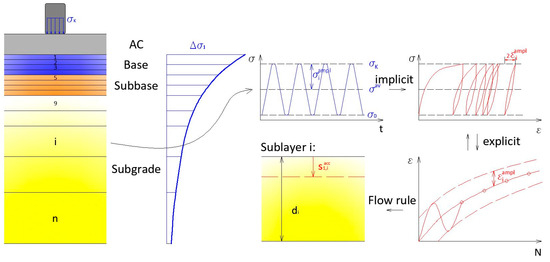 The determination of permanent deformations has two fundamental approaches. Implicit methods directly calculate each cycle using a material model based on stress–strain increments and the residual deformation appears as a “by-product” of the calculation. The biggest disadvantage of these methods is that the calculation (integration) and material model errors are gradually accumulated with each load cycle; therefore, they can only be used reliably for < 50 cycles [17].