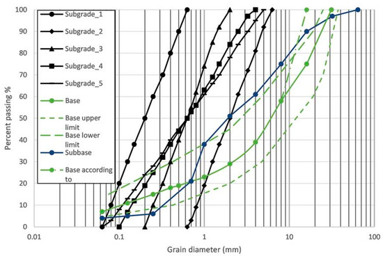 It is assumed that the subbase course has a relative compaction of R.C. = 95%. The bearing capacity (E2) modulus of the subbase material based on finite element calculation [31] is approx. An amount of 150 MPa, thus an E2,sb of 60 MPa, can be expected on top of the subbase. It is assumed that the crushed stone base course has a relative compaction of R.C. = 96%. The bearing capacity (E2) modulus of the crushed stone material based on finite element calculation [31] is approx. An amount of 230 MPa, thus an E2,b of 125 MPa, can be expected on top of the base course, which complies with the international practice of flexible pavement construction. Because there was no Proctor test available for the subgrade, it was assumed that ρdmax corresponds to a void ratio of e = 0.95 emin. The particle size distribution of the analysed layers is shown in Figure 2, whereas their properties are summarized in Table 3.