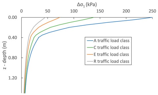 Distribution of the additional vertical stress for traffic load classes A-C-E-R.