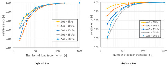 Since the applied material model is nonlinearly elastic, the result depends on the number of load steps. In the model, the load was divided into j equal parts and then it was applied in uniform steps of . A parametric study was performed on soils with different thicknesses and loading and the number of load steps was changed between j = 2-3-4-5-10-20-40-80-200-1000, and then the strain was determined due to load. The relative error, i.e., the ratio of the strain calculated with the actual “j” and belonging to j = 1000 converges to 1.0 over time, so the calculated strains are almost the same, and from an engineering point of view, there is basically no difference between the results. The relative error was calculated in three different depths for five load increments and 10 load steps. The relative error obtained for depths of h = 0.5 m and h = 2.5 m is presented in Figure 4 as the function of the number of load steps. The relative error quickly converges to 1.0; the difference is already negligible at j = 40. The value of relative error ranged from 0.97 to 1.00 in the entire analysed spectrum for j = 40. Due to the above reasons, the loading step of j = 40 was used in all the calculations, which already yields sufficiently accurate results from an engineering point of view.