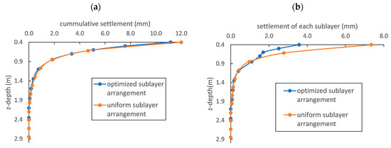 (a) The cumulative settlements and (b) the settlements of each individual sublayer with depth using the uniform and optimized arrangement of sublayers.