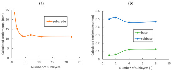 The calculated settlements as the function of number of sublayers. (a) For the subgrade and (b) for subbase and base courses.