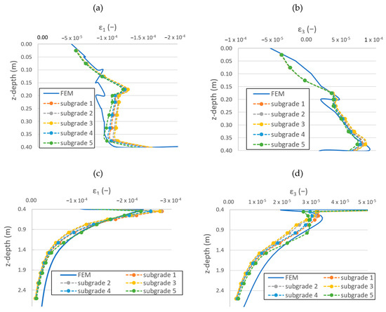 Using the simplified layered method presented in Section 3, Section 4 and Section 5, ε1 and ε3 strains were determined for the traffic load classes A-R and the above-presented pavement layers under a standard axle load, and the results were compared with the finite element analysis results presented in [31]. Figure 7a,b show the vertical and horizontal strains in the base and subbase courses for traffic load class E. The ε1 values adequately approximate the vertical strain obtained by the finite element analysis, except for the boundary of the subbase and base courses. The shape of the functions is also satisfactory However, the simplified model predicts that the vertical strain decreases with depth in the subbase layer, whereas the finite element analysis shows that it increases slightly with depth Figure 7a. The minor horizontal strain almost perfectly matches the results of the finite element analysis (Figure 7b). Figure 7c,d show the results for the subgrade, where a good match between the results can be observed. The vertical strain is slightly overestimated in the top of the layer, whereas it is slightly underestimated in the lower portions. The horizontal strain is always underestimated except for the topmost part of the subgrade.