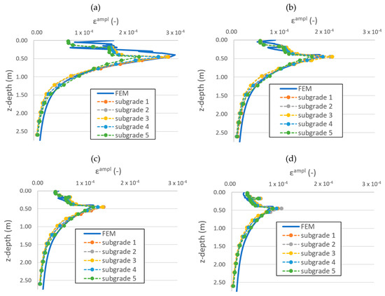 The calculated εampl-z function with the simplified layered model for five different subgrades and with finite element model (a) Traffic load class “A”; (b) Traffic load class “C”; (c) Traffic load class “E”; (d) Traffic load class “R”.
