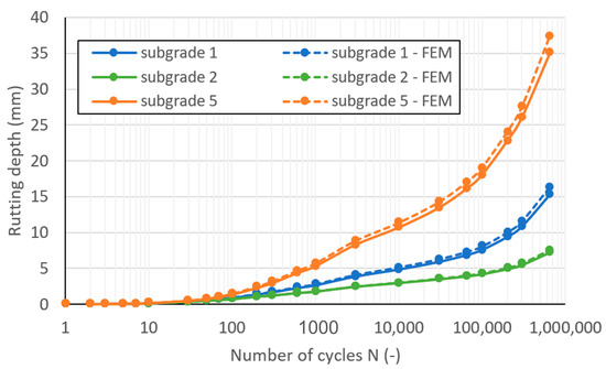 This section presents the residual rutting depth for subgrade 1 for each traffic load class as a function of the number of cycles, and a comparison is made between the results obtained by using the simplified layered model to determine the input parameters and by using the finite element model (Figure 10). As the figure shows, the rutting depth calculated from the input data of the simplified layered model approximates well the result of the finite element model regardless of the traffic load class. At the end of the design working life, the difference between the calculated settlements is approx. 2–5%.