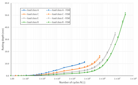 The pavement structure of the traffic load classes was devised in such a way that the stresses resulting from the repeated passing of axles with different numbers of cycles cause the same fatigue in the asphalt course over the entire design working life. Based on Figure 10, this is not true for the rutting depths as at the end of the design working life, they increase with the traffic load class. However, the rutting depths are smaller in the higher load classes for the same number of cycles. This is logical since the thicker asphalt course of the higher traffic load class distributes the wheel load better, so smaller stresses reach the underlying layers, and therefore εampl will also be smaller. Consequently, the accumulated strains are smaller in the higher load classes for the same number of cycles. This means that in load class A at the end of the design working life, i.e., after 65,000 axle passes, the rutting depth is approx. four times the rutting depth of the class R at the same number of cycles. However, traffic load class R suffers approx. 4.6 times greater rutting depth by the end of the design working life as it is subjected to approx. 460 times more axle passes.