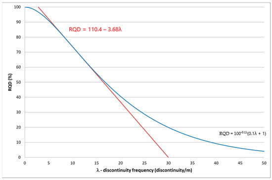 RQD can also be determined from discontinuity frequency obtained from scanline sampling. Priest and Hudson [14] suggested a negative exponential distribution. According to their calculation, the relationship between RQD and a linear discontinuity frequency, λ is as follows:
