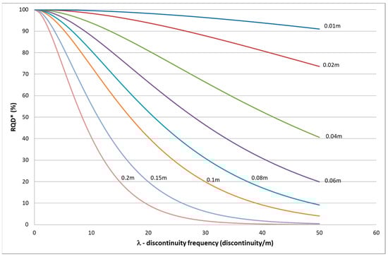 The curves of the theoretical RQD against values of λ (0–50) for various threshold values t, using Equation (3) are plotted in Figure 2. The figure demonstrates the disadvantages of both the RQD additive principle and the threshold value principle. The curves show that the larger the threshold value t, the steeper the drop of the RQD as a function of k. This is because smaller core pieces are disregarded. However, as the threshold value decreases, the drop of RQD becomes flatter. This is because all the shorter cores are now taken into account, although their number and, consequently, the number of fractures are not included. It can be argued that using some middle threshold value, such as 0.1 m, or selecting an appropriate threshold value for a given rock mass compensates these disadvantages [15].