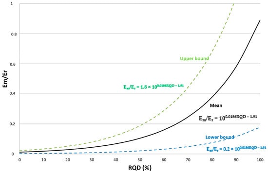 This value can be used for estimating the deformation moduli of the rock mass [25,26]. Zhang and Einstein [26] calculated the relationship between RQD and the ratio of deformation moduli of rock mass (Em) and the intact rock (Er). By processing a large number of measurements, they determined the following relationships (see Figure 3):