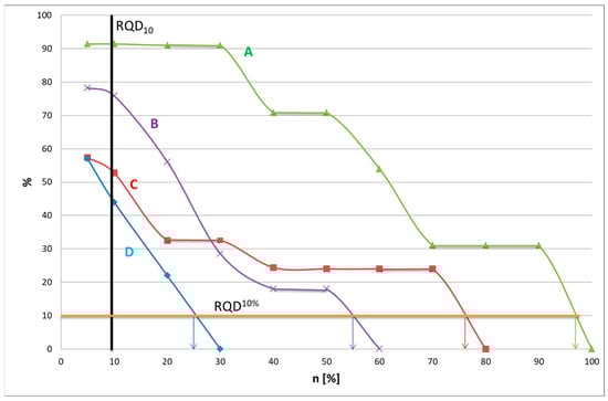 In Figure 8, the 10% probability size is also marked separately—using RQD10% symbol (see orange line). It can be seen that while the RQD value is larger in case B than in case C, this 10% limit is associated with longer core pieces in case C.