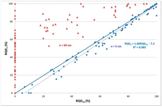 Figure 9 shows how the RQD values interpreted for the original 10 cm length compare with the core lengths evaluated under the new approach. Figure 10 introduces a very close relationship between the smallest core lengths of 5 cm and the original RQD values. The RQD values interpreted for the 50 cm core length and the RQD values as originally defined are much more divergent, and the closeness of the relationship is questionable. Such a figure may also characterize rock type properties for site investigation evaluations.