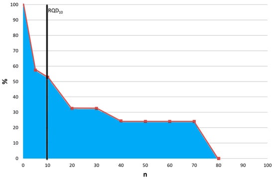 The curves show clearly whether a given RQD value is associated with longer or several shorter core sections, and also that the order of fragmentation of the sections varies for different RQDn values. Some of the RQDn values (n = 5; 10, 50 cm) are summarized in Table 3. The shape of the curve gives a good indication of the quality of the rock and the size of the blocks. It is easy to see which size of block is predominant in the studied section. In case of a geotechnical drilling program, it is possible to characterize the core sections and classify into groups on the basis of plotting RQDn % values.