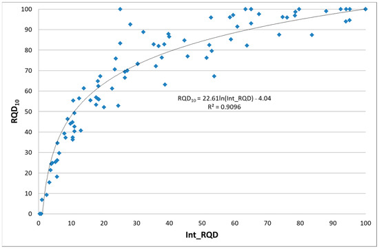 Logarithmic relationship was found between the Int_RQD and RQD10 values (see Figure 12).