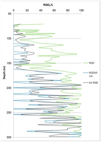 Regarding the data of different fracture density approaches in the function of depth (Figure 13), it is obvious that RQDn and integral RQD give more information about the characteristics of a fractured rock mass. Based on these plots, distinct rock mass domains can be divided and boundaries can be observed more easily. Moreover, the minimum values of RQD 50 cm or integrated RQD allow identify the possible tectonic zones with smaller rock pieces in a more expressive way. Using it with other borehole logs, it is an effective procedure to create a more suitable geotechnical profile of the investigated rock mass.