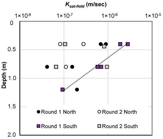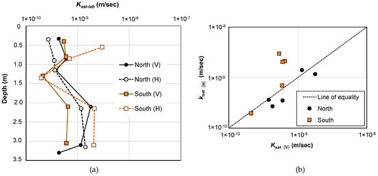 The results of the vertical and horizontal Ksat-lab tests are presented in Figure 3a as a plot against the depth of sampling. The results of the laboratory tests were indicative of low plasticity clays generally, falling within the range of 3 × 10−09 to 2 × 10−10 m/s. In terms of vertical Ksat-lab, the most permeable soil (1.8 × 10−09 m/s) was the clay of intermediate plasticity at 2.1 m depth from the North BH, and the least permeable (2.1 × 10−10 m/s) was the highly plastic red-brown clay at 1.3 m deep from the South BH. With respect to horizontal Ksat-lab, the most permeable soil (3 × 10−9 m/s) was the Black earth soil, just below the surface in the South borehole, while the least permeable soil (2.0 × 10−10 m/s) came from 1.35 m depth in the same borehole, from the highly plastic red-brown clay. The Black earth from the South BH was classified as low-plasticity clay (see Table 2).