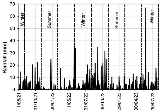 A weather station was installed and operated since 1 August 2021. The weather station was located ~900 m South-West of the research site. Recordings were made at five-minute intervals. Recorded parameters included temperature, relative humidity, relative air pressure, wind speed and its direction, rainfall and solar radiation. A plot of daily rainfall is presented in Figure 4. The yearly rainfall for 2022 was 760 mm, which is significantly higher than average. A further 394 mm of rain had been recorded in 2023 by 28 August 2023. The maximum daily rainfall was 67 mm on 22 June 2023. Heavy and persistent rain events are generally expected over winter and spring (June to November). Rain was less frequent and intense over the summer.