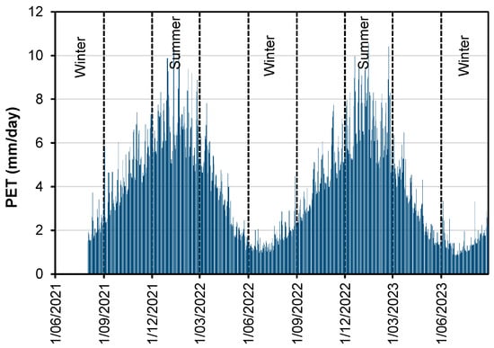 The daily reference Potential Evapotranspiration (PET) was estimated from the weather data for clipped grass using the method prescribed by ASCE-EWRI [58]. PET reached a peak of ~11 mm/day over the summer months and dropped to a low of 1 mm/day at the start of winter (see Figure 5).