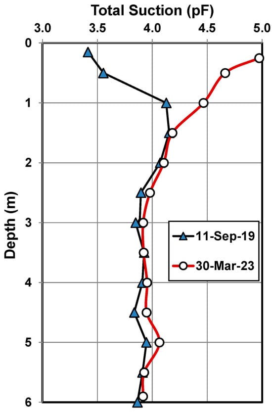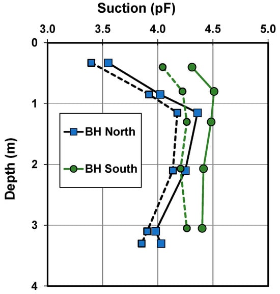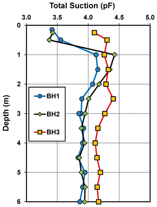 Total suction (s) profiles for September 2019 were developed from borehole samples and are presented in Figure 6. The suction profiles indicate shallow wetting; BH1 was wetter than BH2 to about a depth of 3 m. Suction values at greater depths were similar. The deep equilibrium suction below 2.5 m for this site can be interpreted as being 800 kPa or 3.9 pF according to the suction profiles for BH1 and 2. Suctions at BH3 present a different picture. Being close to the tree line suctions at depth are consistently higher than either those from BH1 or BH2. Below 3.5 m, the difference is approximately 0.24 pF all the way to 6 m depth. This is also the depth and trend indicated by Cameron [59] and Cameron and Beal [60] due to groups of trees in the prevailing climate in Adelaide. Soil suction is largely constant in the zone below normal drying activity and corresponds to the wilting point of the trees. The depth of drying in Adelaide may approach 6 m for trees in competition for moisture [60]. The difference in total suction observed at this site is towards the lower limit of the range reported previously for South Australia of 0.23 to 0.4 pF.