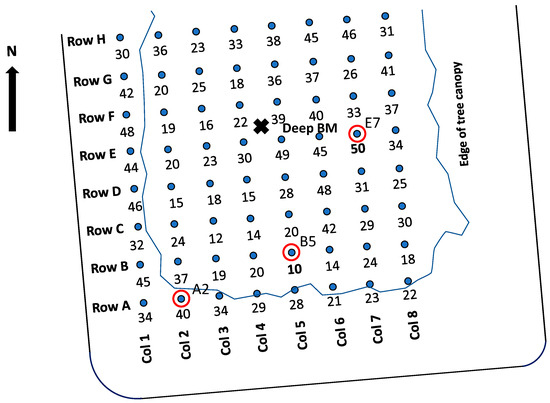 Near-surface movements across the site relative to a 6 m deep BM have been monitored every 2 to 3 months since November 2019 by licensed surveyors using a Leica digital level. Sixty-four concrete pads buried 0.35 m below the soil surface and covered with an irrigation valve box were established on a grid of 8 m spacing over an area of 3100 m2. The locations of the pads are shown in Figure 1. Concrete pads were 0.1 mm thick and 0.4 m in diameter and were anchored to the soil with a vertically placed 16 mm diameter bar, 400 mm long, set in the concrete and extending 0.15 m below the pad into the soil. The top of the bar served as the level survey point on the grid. The research site is an open field and undergoes regular mowing and other maintenance activities, and so council vehicles frequent the area. The concrete pads helped provide a reasonably stable movement measurement location and were not significantly affected by the movement of maintenance vehicles.