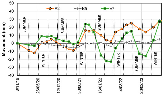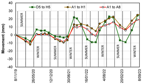 Average movements along the canopy lines are provided in Figure 10 for points A1 to A8 and A1 to H1. The movements are compared with the average movement of points D5 to H5, which are well away from the trees. Away from the trees, seasonal movements were significantly greater; near the tree line, the established vegetation had already dried the soils, and the vegetation canopy afforded some protection from extreme seasonal wetting and drying of the near-surface soils, which was also observed by Sun et al. [61] in a field experiment in an outer Melbourne suburb in the State of Victoria.