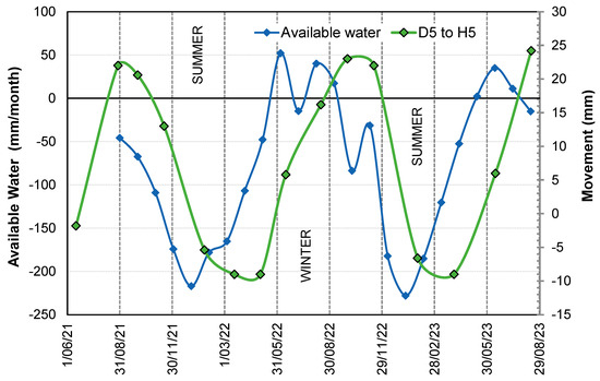Available water for soil replenishment is simply the difference between rainfall and PET, less run-off. To allow for run-off, daily rainfall was held to a maximum of 15 mm, the assumed daily capacity for soil infiltration [40]. At this site, rainfall exceeded 15 mm on just 18 of the 760-day-long monitoring period. In Figure 12, the monthly available water has been plotted against time. The average movement of the central levelling pads along column 5 (D5 to H5) has been plotted in this Figure using a secondary axis. The similarity of the shapes of the plots confirms the strong relationship between water availability and ground movement. There is a noticeable lag between available water and ground movement, which has been observed in other research [40,62]. The time lag can be explained by the slow infiltration into uncracked soil and the sealing of shrinkage cracks during the wet seasons. As illustrated by Figure 11, significant seasonal soil movement is generated by changing the state of suction to at least a depth of 1.5 m at this site. From the plots, the time difference (delay between peaks of monthly available water and peaks in movement) approaches 2 months. A linear relationship was attempted between available water 60 days prior to ground movement measurement and observed ground movement, which required interpolation of weather data. The coefficient of determination of the regression (or R2) was 0.93, indicating a strong correlation. Further data are needed, however.