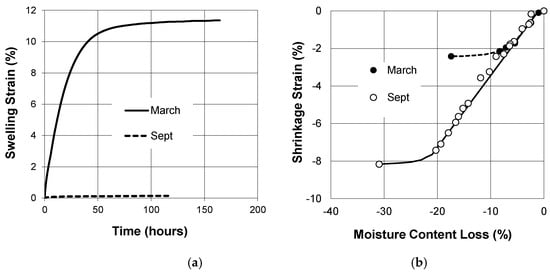 Testing of the CH black earth samples at significantly different initial moisture contents and suctions showed little impact on Iss values. The initial total suctions were 4.93 pF in autumn, which reduced to 3.41 pF in spring at this same location, a difference of 1.5 pF. The autumn sample swelled appreciably (11.4%), but the companion sample shrank relatively little. The soil from the sampling in spring barely swelled, but the shrinkage sample realized −8.2%. Plots of the sample strains in Figure 14 highlight how different the responses were. Nevertheless, the shrink-swell index was not significantly affected: 4.5 %/pF compared with 4.6 %/pF. This is just one example where the initial moisture content did not matter.