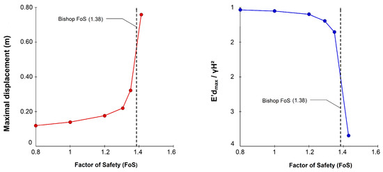 The first criterion is based on the analysis of the horizontal displacement of a specific point (referred to as the bulging point) close to the failure surface (e.g., the nodal point immediately above the slope toe). Failure is thought to have occurred when the displacement of this point exceeds a maximum limit. This agrees with the observation reported in [9]. When examining the evolution of the maximal displacement of the bulging point (or a dimensionless expression of this displacement, , where is the maximum nodal displacement at convergence and is the height of the slope) versus the reduction factor , the authors pointed out that there is a sudden acceleration of maximal displacement close to the LEM value of safety factor (see Figure 1 based on the results from [9]). This method introduces two sources of arbitrariness in the choice of the bulging point and on the maximum displacement allowed before failure.