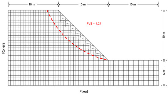 The stability of this slope has been preliminary analyzed using the LEM with Bishop’s simplified method. This approach provides a safety factor equal to 1.21, corresponding to those computed with similar methods (i.e., 1.20, 1.21, and 1.21) by Cho (2010) [4], Li et al. (2015) [5], and Liu et al. (2017) [6], respectively. The obtained failure surface is represented by the red dashed line in Figure 3.