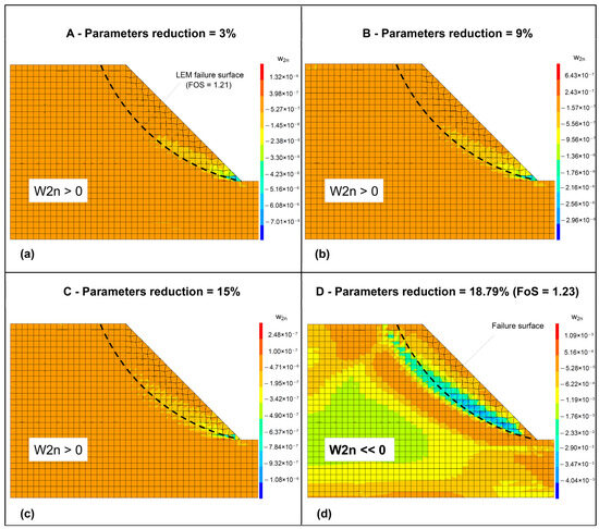 The four graphs Figure 4a–d represent the negative local second-order work field at different reduction levels (3%, 9%, 15%, and 18.79%, respectively). On these graphs, the black dashed line represents the LEM failure surface, corresponding to a safety factor of 1.21 (i.e., a 17.35% reduction).