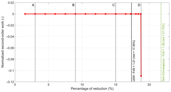 The convergence of the algorithm can be visually followed with the curve of Figure 5 showing the normalized second-order work’s progression. The notations A, B, C, and D refer to Figure 4. The lack of convergence of the computation occurs for a reduction of 21.75% in the parameter values, corresponding to a safety factor SF = 1.28 (materialized by the green vertical line on Figure 5).