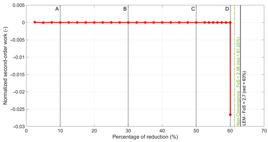 In Figure 8, the curve of the normalized second-order work’s progression shows the convergence of the algorithm. The notations A, B, C, and D refer to Figure 7. The lack of convergence of the computation occurs for a reduction of 61.25% in the parameter values, corresponding to a safety factor SF = 2.58 (materialized by the green vertical line in Figure 8 and Figure 9). As in the previous example, the value of (red curve in Figure 8 and Figure 9) fluctuates around zero with very small absolute values until the 27th iteration. Then, a drop is clearly observed at the 28th iteration for a reduction of 60.03%. This corresponds to a safety factor of 2.50.