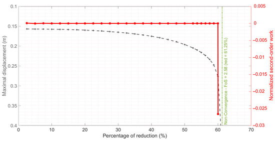 Figure 9 compares the evolution of the second-order work and the maximum displacement as a function of the parameter reduction. The initial reduction step used in this case was equal to 2.5% and the reduction step is reduced since the 21st iteration (reduction of 52.5%). With a traditional approach, the evolution of the maximal displacement (grey curve on Figure 9) displays a classical trend, with a sharp increase in the displacement as the failure approaches. It can be seen that the asymptote of this curve is the line corresponding to the non-convergence (reduction of 61.25%).