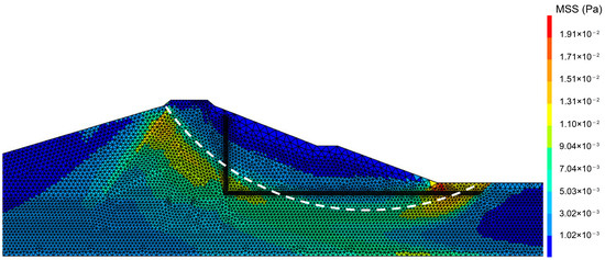It is worth noting that this band is coherent with the maximal shear strain (MSS) band obtained in the computational step before the lack of numerical convergence (Figure 10). On Figure 10, it could be seen that the MSS band is not continuous. The area beneath the drainage system has few deviatoric deformations but it is here where the local second-order work is clearly negative, as seen on Figure 7d.