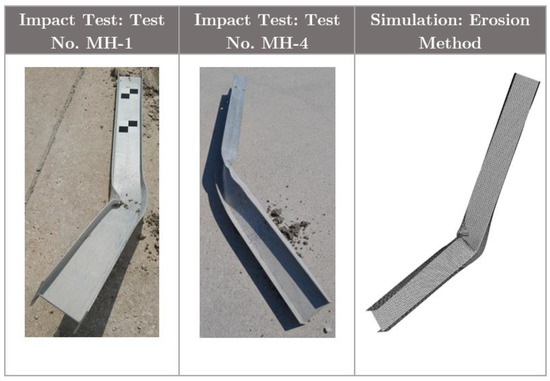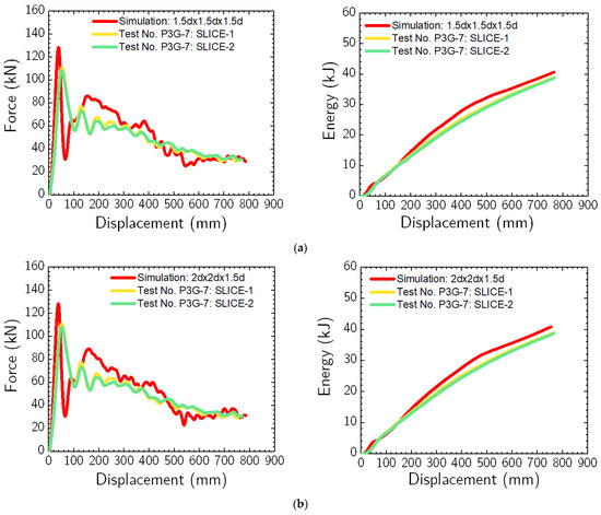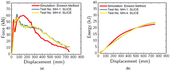 (a) Force vs. displacement and (b) energy vs. displacement plots from simulation using erosion method and physical impact tests (i.e., test nos. MH-1 and MH-4).