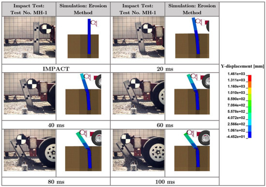 Comparison of time-sequential images derived from physical impact test and simulation using erosion method for 1830-mm long, W152 × 12.6 steel pile embedded in granular (MASH strong) soil. Note that 1.461 × 103 on the scale indicates 1.461 × 103.
